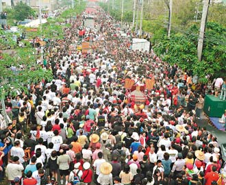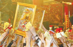 中新網(wǎng)4月14日電 經(jīng)過(guò)八天七夜繞境出巡,臺(tái)灣大甲媽祖神轎昨天回鑾到臺(tái)中縣大甲鎮(zhèn)。超過(guò)十萬(wàn)名接駕信眾綿延十多公里。信眾的熱情,讓回鑾的預(yù)定時(shí)間比去年更延遲好幾個(gè)小時(shí),家家戶(hù)戶(hù)備妥香案跪拜,鎮(zhèn)瀾宮深夜十一點(diǎn)舉行安座大典,場(chǎng)面盛大熱情。