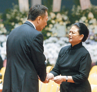 郭臺銘24日上午前往臺塑創辦人王永慶靈堂吊唁,并向三娘李寶珠(右)致意。(圖片來源:臺灣《聯合晚報》)