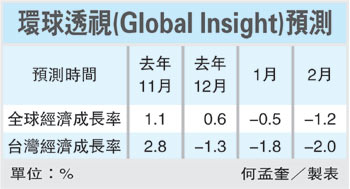 中新網(wǎng)2月18日電 臺灣《經(jīng)濟日報》18日頭條新聞報道說,環(huán)球透視(Global Insight)剛發(fā)布最新經(jīng)濟預測,再度下修臺灣今年經(jīng)濟成長率,并下修到負成長2.0%,甚至比全球經(jīng)濟負成長1.2%還差。