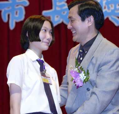 2001年,時為臺北市長的馬英九頒發市長獎給各“國中”優秀畢業生,當頒發給自己的小女兒馬元中時樂得將他拉進自己的懷里擁抱,但馬元中顯得羞澀不自然,甚至白了父親一眼。(臺灣聯合新聞網圖;潘俊宏/攝影)