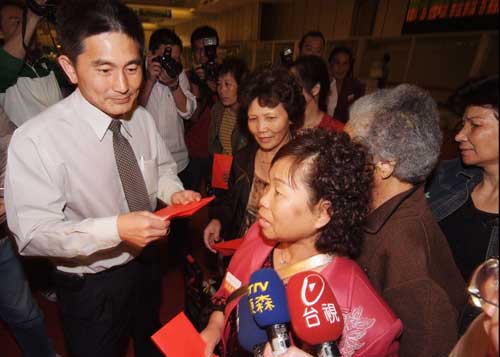 四川強震,受困在都江堰纜車的臺灣旅客十五日凌晨返臺,旅行社遞上紅包壓驚。(“中央社”圖)