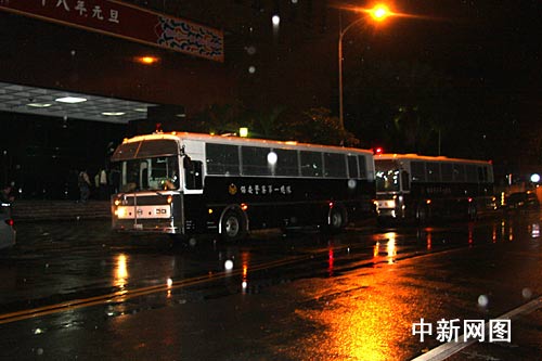 圖為3時30分,臺北地方法院的警備車載著陳水扁離開臺北地院,前往臺北看守所后。臺北地院恢復平靜。保安警察也收工 ,乘車離開。 (中新社記者 陳立宇/攝)