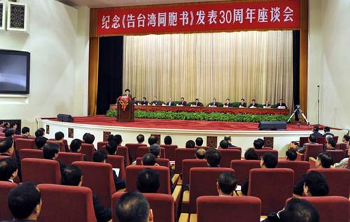 胡錦濤說,1979年元旦,全國人民代表大會常務委員會發表《告臺灣同胞書》,鄭重宣示了爭取祖國和平統一的大政方針,兩岸關系發展由此揭開了新的歷史篇章!陡媾_灣同胞書》的發表,標志著我們解決臺灣問題的理論和實踐進入了一個新的歷史時期。