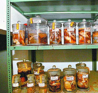 記者通過40米的通道,走到第二棟地勢較低的建筑內(nèi),記者攜帶探照燈,穿過一條白墻走道才轉(zhuǎn)彎進(jìn)入一個(gè)房間,抬頭赫見整排約50罐尸罐,嚇得忍不住后退。原來4排鐵架上擺放裝有各種器官和尸塊的罐子,猶如一座人體器官博物館,令人全身起雞皮疙瘩。