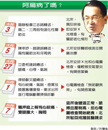 一名不愿具名的精神科醫師則判斷,阿扁出現的各種癥狀可歸為“心身癥”,主要在于他剛從總統卸任不久就被收押,心理無法調適,加上全家面臨官司;而且他在所內獨居一室,都造成他情緒煎熬,無法紓解。他勸扁此刻應“身體放松,腦袋放空”,才是面對未來之策。