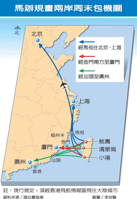 陳世圯指出,馬英九辦公室規(guī)劃北飛上海、北京班機(jī),走馬祖航線飛越海峽中線進(jìn)入上海飛航情報(bào)區(qū);往廣州的航班,經(jīng)金門(mén)附近由汕頭進(jìn)入廣州,往廈門(mén)航班則由金門(mén)附近偏南飛行,經(jīng)惠安抵廈門(mén),都不直接經(jīng)過(guò)金門(mén)上空,舍棄以往繞行香港飛航區(qū)限制;至于進(jìn)入大陸航線如何飛行,仍待兩岸協(xié)商。