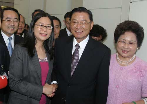 海基會董事長江丙坤(中)十一日啟程前往北京與海協(xié)會展開中斷九年的協(xié)商,臺灣“陸委會”主委賴幸媛(前左)前來送機。( “中央社”圖)