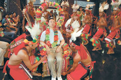 大陸踩線團團長范貴山,被當成臺灣少數民族大頭目,接下許愿酒,連干三杯,許下北京奧運成功、兩岸旅游“火火紅紅”、兩岸人民幸福美滿等三個愿望。