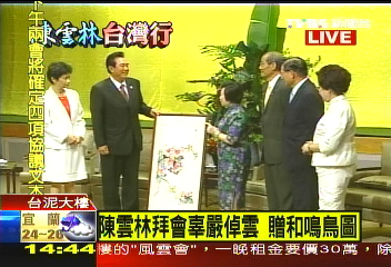 辜嚴(yán)倬云贈上張大千的名作“和鳴鳥圖”給陳云林,象征兩岸“合鳴”。 (來源:臺灣TVBS)