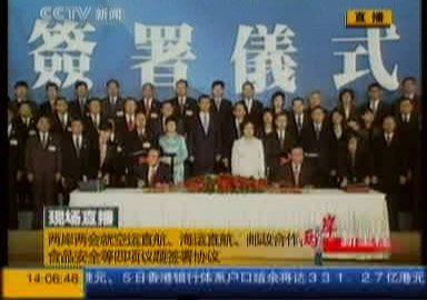 中新網臺北11月4日電 據本網記者從現場發回的消息:大陸海協會會長陳云林與臺灣海基會董事長江丙坤今天下午14時許在臺北就兩岸海運、空運、郵政、食品安全等議題簽署四項協議。