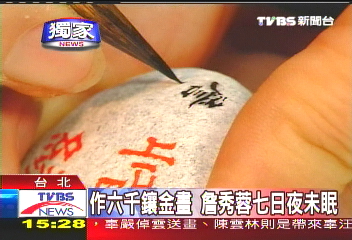 中新網11月4日電 臺北“江陳會談”今天舉行,臺灣海基會準備了鑲有6000金字的“和平協商,共創雙贏”的藝術字畫,送給陳云林。據臺灣TVBS報道,字畫創作者、臺灣藝術家詹秀蓉透露,為了這幅字畫,她不眠不休花了7天時間,才在最后一刻完成。不過,見證兩岸歷史時刻,詹秀容說,她與有榮焉,所以分文不取。