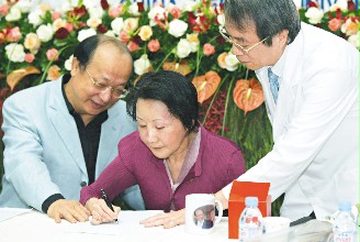 在胡志強的陪同下(左),車禍受傷的邵曉鈴(中)重新拿筆,簽名展示康復成果。(聯合報圖)