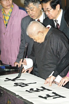 中新網(wǎng)12月4日電 臺(tái)北“中正紀(jì)念堂”牌樓“大中至正”四字從未標(biāo)明由何人所題,臺(tái)灣87歲書法家楊家麟3日說,30年前,前故宮博物院長(zhǎng)秦孝儀要找人寫“大中至正”,許多書法家齊聚一堂,后來因指定要?dú)W陽詢體、不能落款、且當(dāng)場(chǎng)就得寫,這工作才落在他頭上。