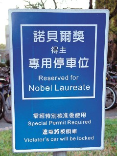 這個(gè)專(zhuān)屬停車(chē)位,位在臺(tái)大小椰林大學(xué)旁的“中研院”原分所后方。停車(chē)位旁還樹(shù)立了一個(gè)醒目的標(biāo)示牌,藍(lán)底白字用中英文寫(xiě)著“諾貝爾獎(jiǎng)得主專(zhuān)用停車(chē)位”,上頭還注明“需經(jīng)特別核準(zhǔn)后使用,違車(chē)將被鎖車(chē)”。