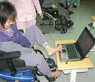 十八年前黃美秀讀埔里中學資源班,老師鼓勵她學電腦,六十六歲的祖母每晚陪她去上課,剛開始練習用腳趾按鍵盤、撥動鼠標,腳上好像綁著大石頭,苦練一星期后,熟練與靈活度已比“正常”同學還要好。現在她的黃金左腳,大小趾并用,一分鐘可輸入二十個字。