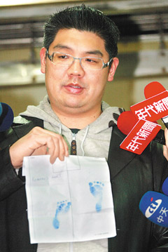 蔡依珊昨天下午產子,新科爸爸連勝文拿著新生兒腳印向媒體公布喜訊。 聯合報圖