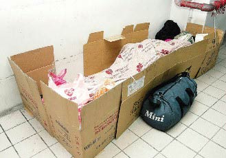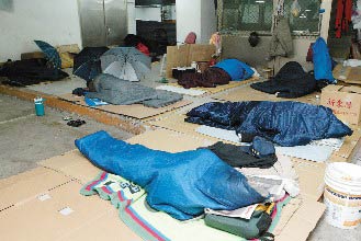 中新網(wǎng)2月15日電 寒流連日來(lái)襲,臺(tái)北市一度掉到攝氏六七度,使得大批游民涌入臺(tái)北火車站避寒。原本約僅數(shù)十名游民“駐地”的臺(tái)北火車站,這幾天一下子爆增到兩百多人。不少游民用厚紙板搭成簡(jiǎn)陋帳篷御寒,雜物散置一地,使得臺(tái)北火車站一些角落仿佛“難民營(yíng)”。