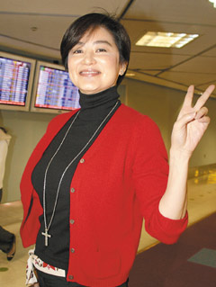 林青霞昨晚比著勝利的手勢返臺投票。(臺灣《聯合報》圖)