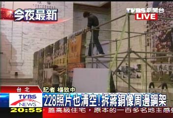 臺(tái)“二•二八”基金會(huì)昨天晚間運(yùn)進(jìn)銅像大廳的“道具”,還包括長(zhǎng)近20米,寬1.5米、共兩幅的大型布幅,上面有大手掌圖樣,掌心則有蔣介石的頭像及“Bye-bye”字樣,掛在蔣銅像前,形成強(qiáng)烈反差。