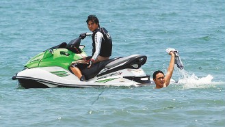 阮經天跳下海后,才悄悄脫掉海灘褲。