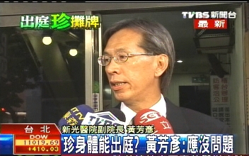 據臺灣TVBS報道,黃芳彥說:“法院的準備都很好,我想都有萬全的準備,因為我不是她的主治醫師,所以病情我也不了解,也不便多透露,我是她的家庭醫生,而她的病需要專科醫生來照顧,我想法院也會以主治醫師的意見為意見。”