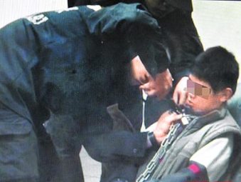 警方試圖剪斷男童脖子上的粗鎖鏈。(來源:臺灣《蘋果日報》)