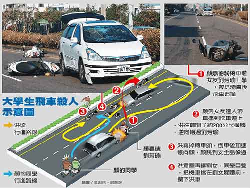 中新網(wǎng)12月19日電 據(jù)臺灣《聯(lián)合報》報道,臺灣臺南縣致遠管理學院大三學生洪琦不滿女友分手,昨天駕車尾隨情敵顏嘉德與前女友劉芳瑜的摩托車,撞倒兩人后,再回轉(zhuǎn)輾過前女友,致前女友當場慘死。