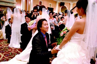 中新網(wǎng)4月16日電 據(jù)臺(tái)灣《聯(lián)合報(bào)》報(bào)道,花蓮縣15日在舉辦集體結(jié)婚,全縣100對(duì)新人完成終身大事,有日本郎娶臺(tái)灣美嬌娘,也有佛教醫(yī)院人員娶基督教醫(yī)院護(hù)士,新人在微微的細(xì)雨中走過許愿池,誓言情愛一生。