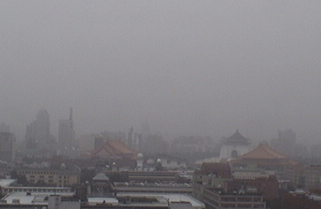 臺(tái)環(huán)保部門設(shè)立監(jiān)測(cè)站以來,25日下午監(jiān)測(cè)到最強(qiáng)的沙塵影響,從“環(huán)保署”樓上完全看不見101大樓。