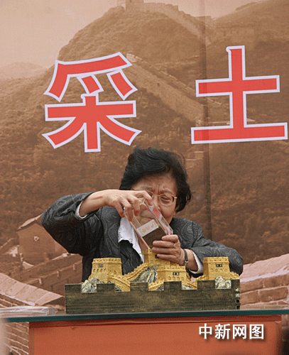 16日上午,在布滿彩旗和鮮花的盧溝橋抗戰紀念館會場,為抗戰英勇捐軀的趙登禹將軍之女趙學芬,將一杯采自昔日戰地盧溝橋的圣土徐徐倒入一尊長城垛子模型內。盧溝橋是“七七事變”發生地,抗日戰爭的序幕由此拉開。