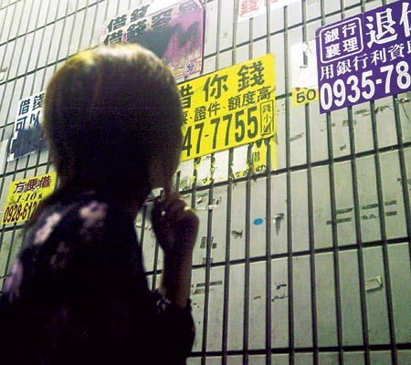 中新網11月1日電 據臺灣《中國時報》報道,臺當局“行政院”十月三十一日通過“融資公司法”草案,被外界視為“地下錢莊”將可順勢合法化,草案內容規定自然人年利率上限為百分之二十,法人的上限為百分之三十。圖為市面街道的借貸放款小廣告。