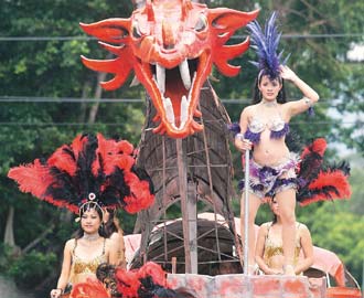 中新網11月5日電 據臺灣《聯合報》報道,臺北2007北投藝術嘉年華昨天熱鬧踩街,現場數十組花車隊伍爭奇斗艷,還有小丑踩高蹺,辣妹熱情的桑巴舞游行車隊,也讓許多人駐足觀賞。