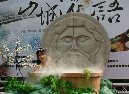 臺灣高雄縣溫泉餐飲業(yè)者推出“山城花語溫泉季”活動,四日記者會中的辣妹泡湯,凸顯活動主題。“中央社”圖 陳守國 攝