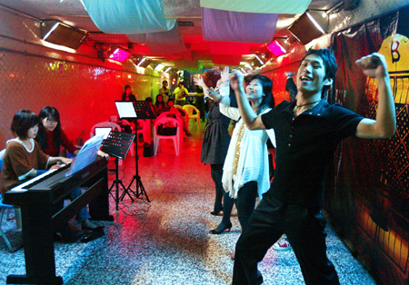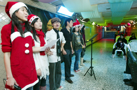 臺灣師范大學前師大路、和平東路口的“師大和平地下道”再度變身,二十日晚間舉行“圣誕老人從地底竄出——圣誕百老匯音樂狂歡夜”,學生演出圣誕音樂劇及歌曲,過往民眾享受節日氣氛!爸醒肷纭眻D 孫仲達 攝