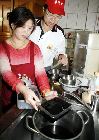 金門縣金寧鄉安岐村住戶自來水管,二十五日中午流出黑色污水,嚇壞村民。“中央社”圖 倪國炎 攝