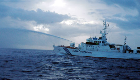 臺(tái)灣“全家福”保釣船十六日搭載著保釣人士前往釣魚島宣示“主權(quán)”,不過,日本保安廳巡邏艦出動(dòng)十多艘,還噴水、企圖碰撞、排黑煙、及蛇行引側(cè)浪企圖阻撓。保釣人士丟擲飲料瓶抗議。“中央社”圖
