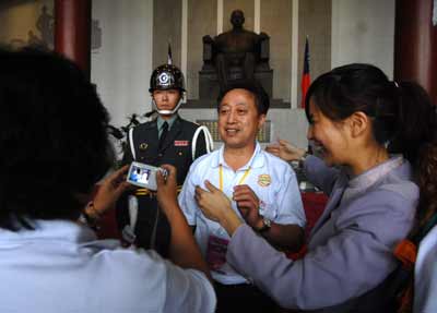 兩岸周末包機四日啟動,廣州首發旅游團抵臺后即前往臺北“國父紀念館”參觀,正好看到三軍儀隊表演,感到很興奮,手中相機拍不停。