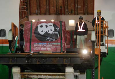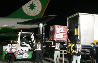 贈(zèng)臺(tái)大熊貓抵達(dá)臺(tái)北桃園機(jī)場,圖為工作人員展開裝載作業(yè) “中央社”圖