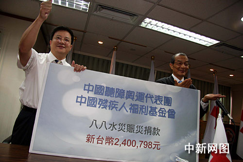 中新網臺北9月8日電(記者 董會峰 劉舒凌)參賽不忘受災同胞。8日上午,中國聽障奧運代表團部分成員專程來到臺灣紅十字組織辦公室,向“八八水災”受災同胞捐款240萬零798元新臺幣。