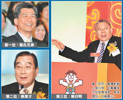 今年上榜富豪中僅5人錄得資產增長,當中3人得益于大陸業務發展。“大贏家”是旺旺集團創辦人蔡衍明,集團在大陸發展強勁,身家急漲10億美元,排名從第9名跳升至第3名。另一食品集團康師傅的創辦人魏應州,身家也大增5.5億美元,升至第5名。