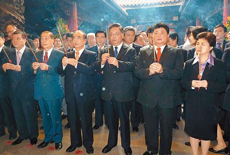 福建省經(jīng)貿(mào)文化交流團(tuán)、莆田市莆臺交流協(xié)會團(tuán)及中華媽祖文化交流協(xié)會團(tuán)等,約一百一十多位成員,受到臺“立法院長”王金平、臺中縣副縣長陳茂淵、議長張清堂,及鎮(zhèn)瀾宮董事長顏清標(biāo)等人的熱烈歡迎。