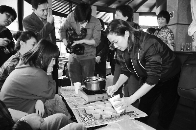 文化館的工作人員正與大陸記者一起制作桑葚果凍。