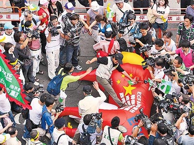 在臺北游行的一些綠營民眾因不滿馬英九與大陸簽署經濟合作架構協議(Economic Cooperation Framework Agreement,ECFA),準備了紅色巨型充氣馬玩偶,上面畫有我五星紅旗標志,還寫著“ECFA傾中賣臺”等文字,并煽動民眾踢踹泄憤。