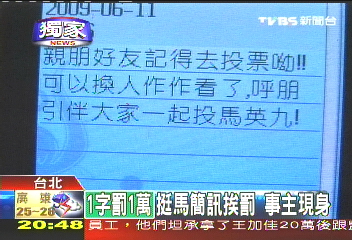 一封提醒親朋好友去投票,還要大家一起投票給馬英九的短信,看的人可以完全不理會,但是傳短信的黎煌雷卻違反選舉規定,在選舉當天幫忙助選,遭臺“中選會”開罰50萬,等于1字要價1萬,黎煌雷不服氣要上訴。