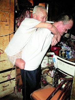 中新網6月15日電 據臺灣《聯合報》報道,苗栗市一對身體殘缺的父子相依為命,互為對方手腳;他們一個沒有雙手、一個沒有雙腳。