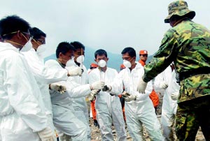 “衛生署長”楊志良說,當災民們看到志工及臺軍官兵都戴上口罩時,或許心里會覺得怪怪的,但還請大家見諒,因為這也是為了保護災民。由于甲型流感好發于年輕人,戴上口罩,這也讓救災的年輕士兵多了一層保障。