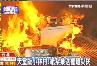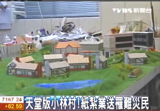 中新網(wǎng)9月4日電 臺(tái)灣“八八水災(zāi)”毀了高雄縣小林村,3日正逢中元節(jié),臺(tái)北縣有家專(zhuān)門(mén)制作“天堂配件”的紙?jiān)荆瑸樽屗勒甙蚕ⅲB夜趕工蓋出“天堂版小林村”,里頭除了住家、學(xué)校以及商店街,希望火化后,能讓不幸的罹難者,在天上有棲身之地。