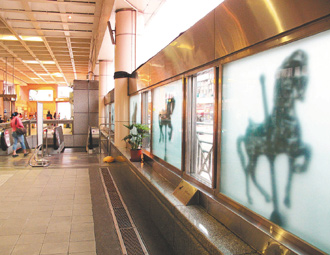 還有府中站“空間之詩(shī)”,造型特殊的長(zhǎng)條型LED字幕機(jī),民眾可用簡(jiǎn)訊上傳詩(shī)文發(fā)表,但似乎使用率也不高,古亭站“邂逅”,造價(jià)近500萬元,12件臉譜創(chuàng)作,因高度過高、不易清理,已經(jīng)看得出“歲月”留下的痕跡,中正紀(jì)念堂往金華街通道“非想、想飛”,造價(jià)320萬元,原有的攝影作品已不復(fù)見,只剩黑漆漆的長(zhǎng)條框框。