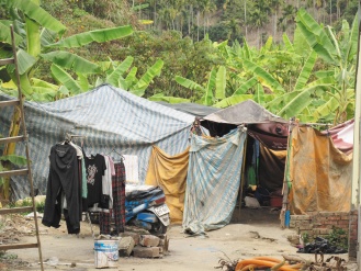 簡陋破落帳篷搭在香蕉園里,卓姓夫妻與兒子擠在不到兩坪的空間里;室內堆放著臟亂衣物等用品,睡覺的地方用木板稍隔開,陳設比起工寮還要簡陋。緊鄰廚房僅有一只燒柴鍋子,卓家女主人鍋子正在蒸蛋,蒸蛋的水暗沉,她說:“這是早餐。”