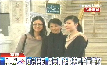 為了云門的歡迎酒會(huì),周美青還特地?fù)Q上了黑色長裙套裝,兩個(gè)女兒馬唯中、馬元中也從紐約趕到華府陪母親,在這個(gè)正式的場合,馬家姐妹也以正式套裝美美亮相,馬唯中和媽媽一樣一身黑,馬元中則是穿上了淺咖啡色小洋裝。